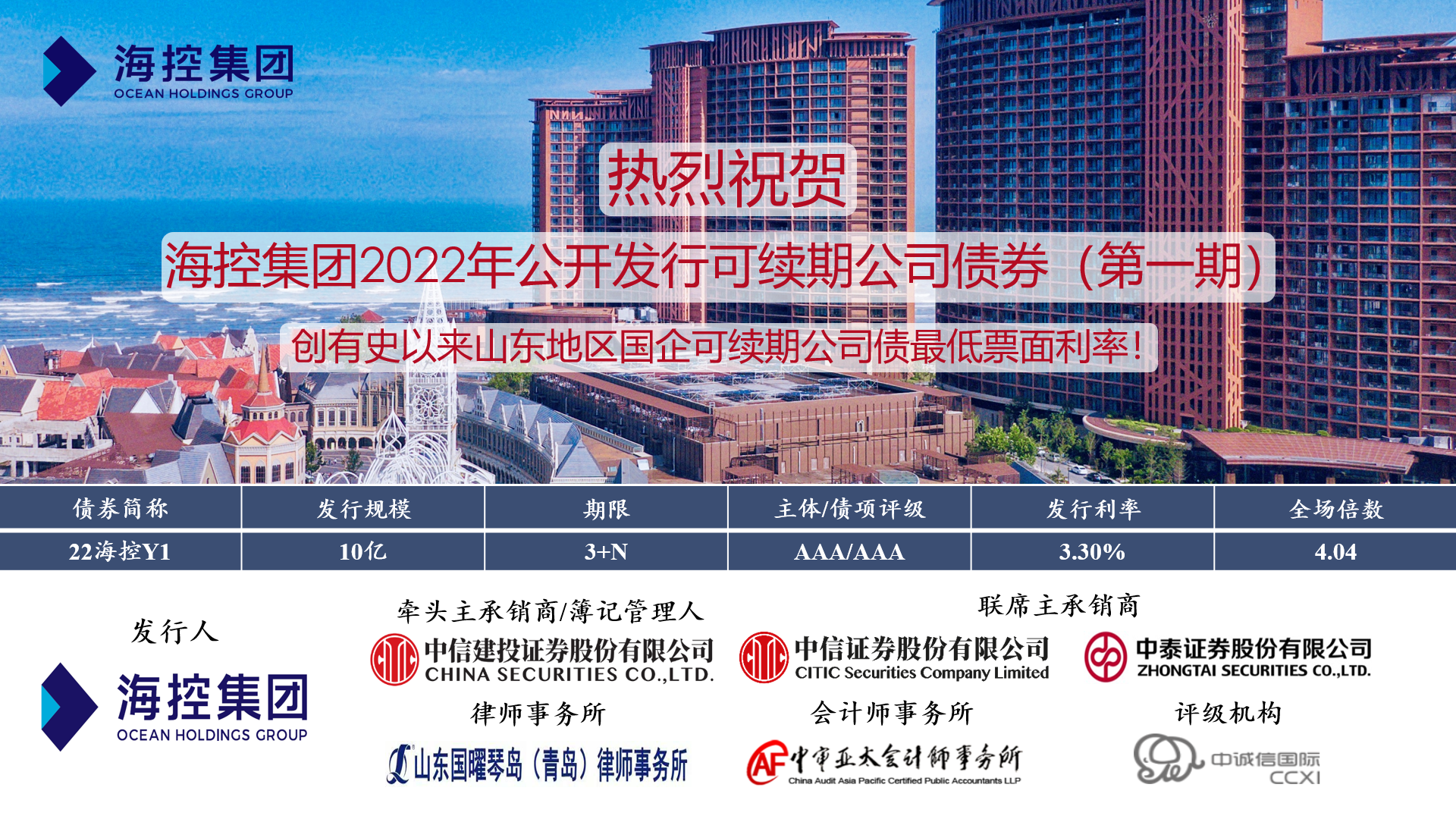 近日,海控集團“2022年公開發行可續期公司債券(第一期)”成功發行,期限3+N年,發行金額10億元,認購倍數4.04,發行票面年化利率3.30%,創有史以來山東地區國企可續期公司債券最低票面利率。