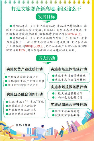 在發展目標方面,《方案》明確提出,到2024年底,全區文化旅游環境、市場秩序持續向好,海洋文化旅游實現重大突破,文旅融合新型業態快速發展,市民游客滿意度穩步提升,游客接待量同比增長20%以上。到2025年底,全區文化旅游國內外吸引力、影響力、競爭力顯著提升,一批優質文旅重點項目建成使用,文化和旅游產業規模達到900億元以上,文化和旅游產業增加值占GDP比重達到13%,國際濱海旅游目的地建設初見成效。