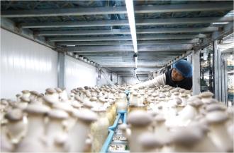 ▲大村鎮食用菌產業園樓宇工廠化基地里雪蓮菇豐收