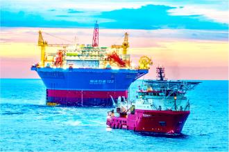 ▲6月10日,在新區(qū)建造的亞洲首艘圓筒型浮式生產(chǎn)儲卸油裝置“海葵一號”完成海上安裝